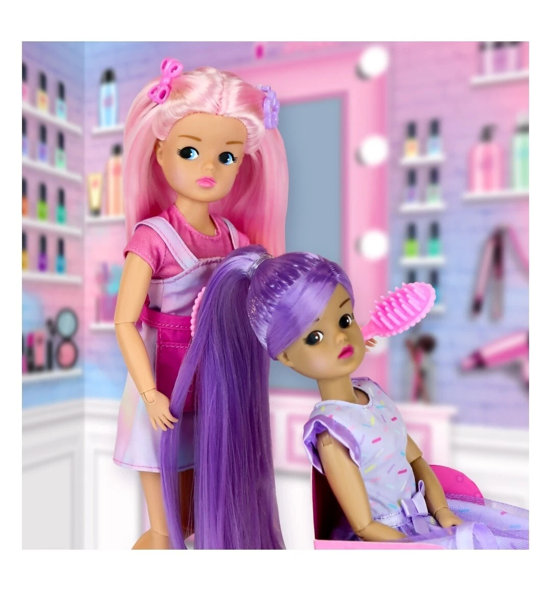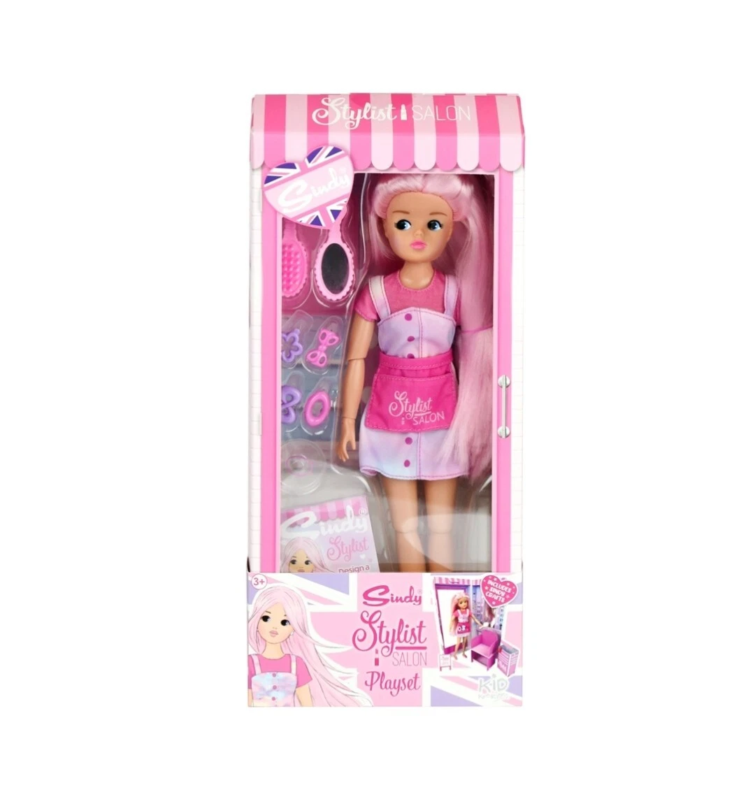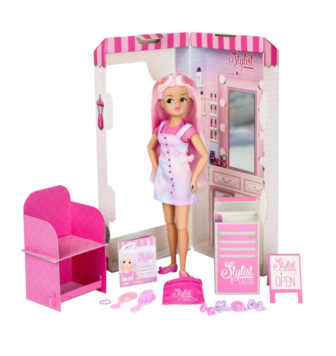 Salon Stylist Sindy is the perfect playset for any doll lover who just loves making new friends. She wears a bright pink tee, pastel tie dyed dress, bright pink ballet shoes and a pink accessories belt. She comes with super silky long pastel pink hair which she loves to try new styles with.
